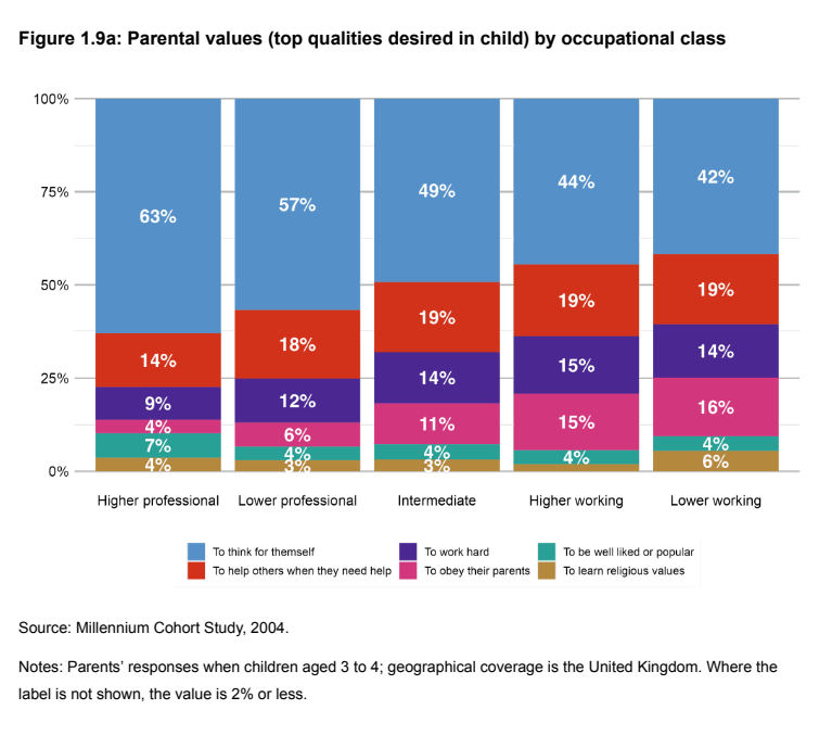 In a more recent report by the same Commission titled Childhood Origins, we discover some (be it of limited scope) research on how parental values and expectations of children vary across a number of socio demographic variables.
