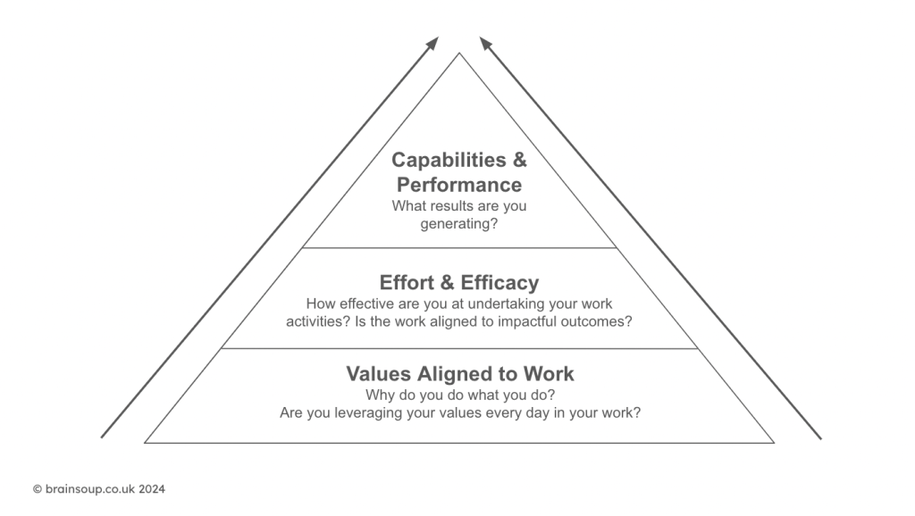 What’s more, by acutely aligning your values in this way, you create a level of fulfillment that helps you meet the bar for self actualisation through your work. At this point, your input effort is maximised, as you are working towards an outcome that pays dividends on your ability to experience meaning through work. This creates a loop which continually spurs you on as you see results and find meaning from following the path of your values.