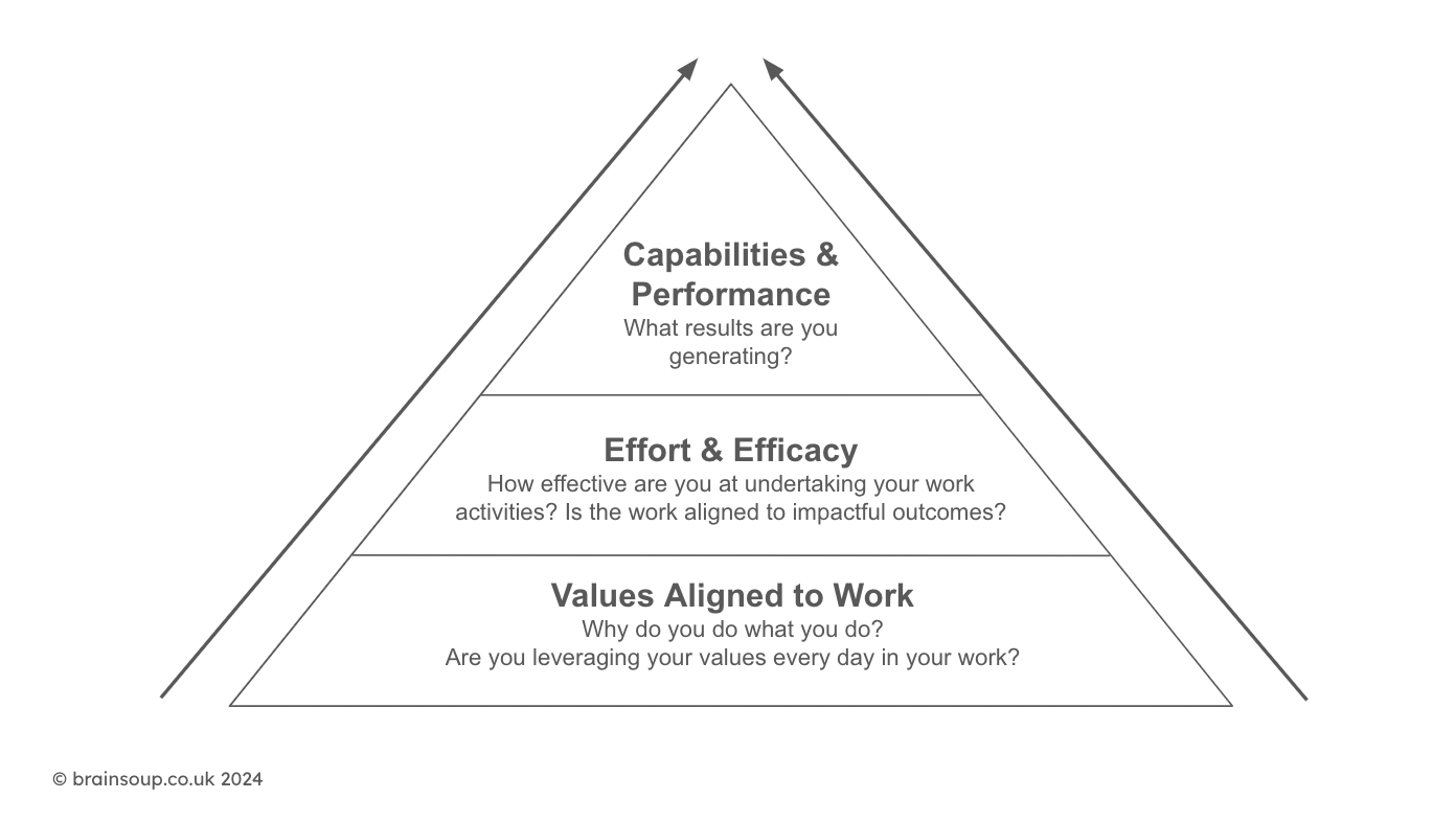 What’s more, by acutely aligning your values in this way, you create a level of fulfillment that helps you meet the bar for self actualisation through your work. At this point, your input effort is maximised, as you are working towards an outcome that pays dividends on your ability to experience meaning through work. This creates a loop which continually spurs you on as you see results and find meaning from following the path of your values.